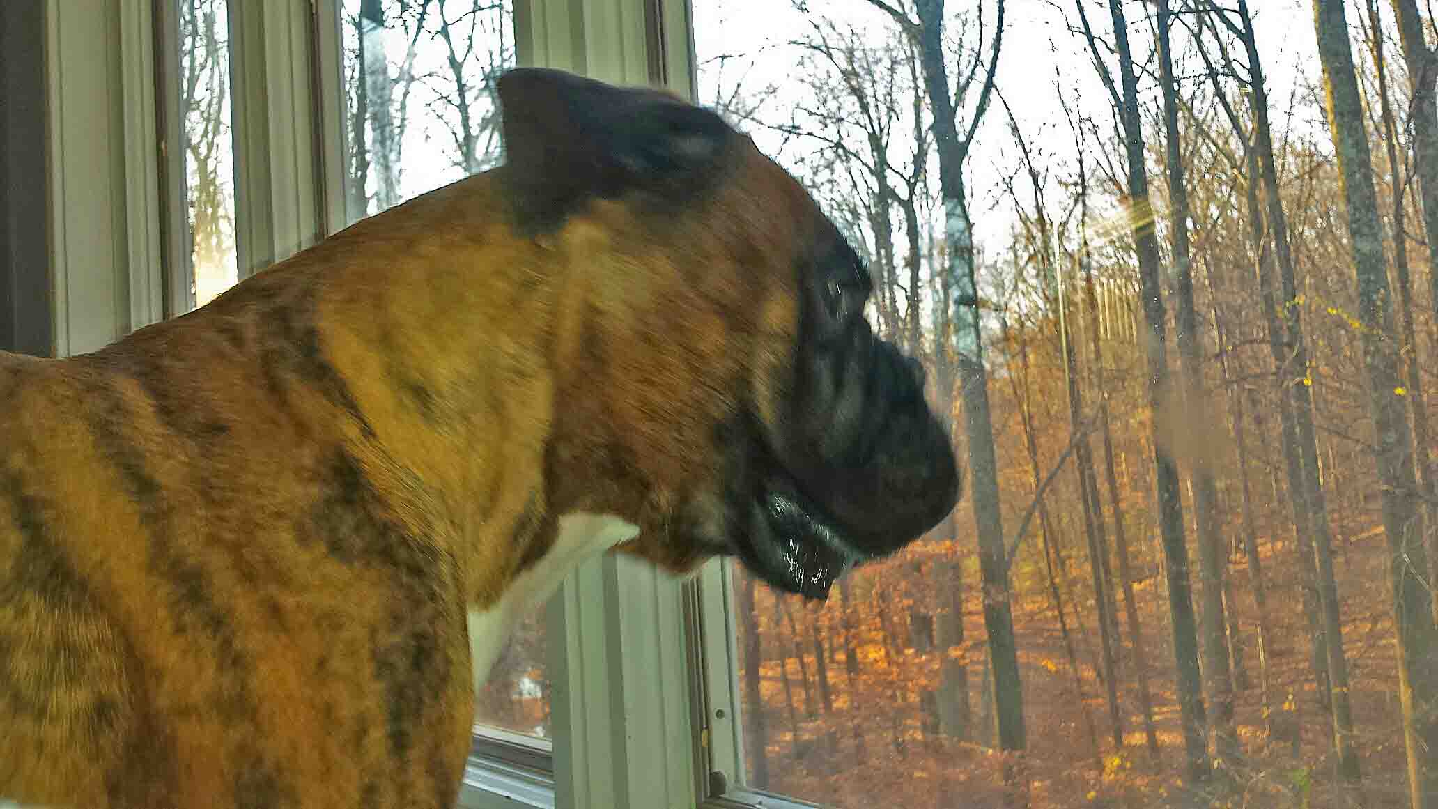 Rupert has a killer view - he can just chill out and watch squirrels, dear, beavers, and birds, right from his favorite chair.